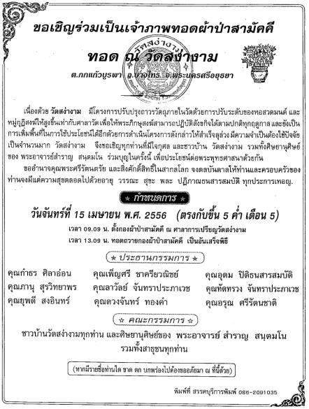 ขอเชิญร่วมเป็นเจ้าภาพทอดผ้าป่าสามัคคี ทอด ณ วัดสง่างาม ต.กกแก้วบูรพา อ.บางไทร จังหวัดพระนครศรีอยุธยา ใน วันที่ ๑๕ เมษายน ๒๕๕๖ เวลา ๐๙.๐๙น. เป็นต้นไป