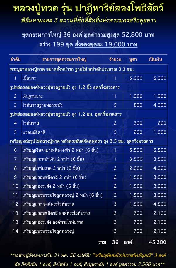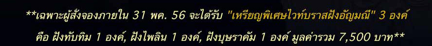 *เฉพาะผู้สั่งจองชุดกรรมการใหญ่ของลป.ทวด รุ่นปาฏิหาริย์สองโพธิสัตว์ภายใน 31 พค. 56 จะได้รับ "เหรียญพิเศษไวท์บราสฝังอัญมณี" 3 องค์ คือ ฝังทับทิม 1 องค์, ฝังไพลิน 1 องค์, ฝังบุษราคัม 1 องค์ มูลค่ารวม 7,500 บาท**