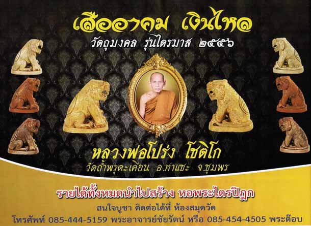 ....ประชาสัมพันธ์ มีข่าวมาบอก ช่วงไตรมาสนี้ ทางวัดพรุตะเคียนได้สร้างเสืออาคม เพื่อสร้างหอพระไตรปิฏก ด้วยความเมตตา ของหลวงพ่อโปร่ง วัดถ้ำพรุตะเคียน อ.ท่าแซะ จ.ชุมพร ได้สร้าง เสืออาคมตัวใหญ่ เพื่อให้ชาวบ้านละแวกใกล้เคียงและประชาชนทั้วไปได้บูชากัน เป็นเอกลักษณ์เสือใหญ่ของวัดพรุตะเคียน และหลวงพ่อโปร่งตั้งใจปลุกเสกเดี่ยวให้ช่วงเข้าพรรษานี้ สำหรับท่านที่ยังไม่มีเสือหลวงพ่อโปร่ง ไม่ควรพลาดด้วยประการทั้งปวงนะครับ พระชุดนี้วัดสร้างเอง จึงเปิดรับจองที่วัดถ้าพรุตะเคียนเป็นหลักด้วยจำนวนสร้างที่น้อยมีไม่มาก คาดว่าช่วงออกพรรษา เสืออาคมตัวนี้คงหมดแน่นอนครับ ผมได้ช่วยทางวัดประชาสัมพันธ์มาตั้งแต่ต้นได้รับความเมตตาจากทางวัดไห้ยอดมาพอสมควร เปิดให้จองในเวบยูที่นี่ที่เดียว เร็วๆนี้ครับ รายละเอียดจะนำมาบอกกล่าวในโอกาสต่อไปครับ จำนวนสร้าง เสืออาคมรุ่นเงินไหล หลวงพ่อโปร่ง โชติโก วัดถ้ำพรุตะเคียน เนื้อทองคำ สร้างตามจองไม่เกิน 29 ตัว ราคาจอง 99,999 บ. (นน.ประมาณ 45-50 กรัม) เนื้อเงินบริสุทธิ์ จำนวนสร้าง 299 ตัว ราคาจอง 2,000 บ. เนื้อนวะโลหะ จำนวนสร้าง 399 ตัว ราคาจอง 1,000 บ. เนื้ออัลปาก้า จำนวนสร้าง 499 ตัว ราคาจอง 500 บ. เนื้อทองทิพย์ จำนวนสร้าง 999 ตัว ราคาจอง 400 บ. เนื้อทองแดง จำนวนสร้าง 2,999 ตัว ราคาจอง 300 บ. สนใจรายละเอียดเพิ่มเติม ติดต่อวัดถ้ำพรุตะเคียน พระอาจารย์ชัยรัตน์ 085-4445159 และพระต็อบ 085-4544505 รายได้ทั้งหมดเพื่อสร้างหอพระไตรปิฎก วัดถ้ำพรุตะเคียน อ.ท่าแซะ จ.ชุมพร กำหนดปิดรับจอง30กันยายน2556 รับพระ27ตุลาคม2556 เป็นต้นไป วัตถุมงคลทุกรายการ ตอกโค๊ดพร้อมหมายเลข ตลับใส่อย่างดีจากโรงงานวิชั่นครับ |