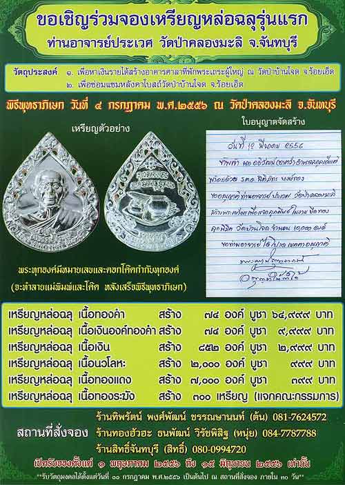 ขอเชิญร่วมสั่งจองเหรียญหล่อฉลุ รุ่นแรก ท่านอาจารย์ประเวศ วัดป่าคลองมะลิ