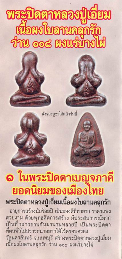 พระปิดตาหลวงปู่เอี่ยม เนื้อผงใบลานคลุกรัก อายุนับร้อยปีเป็นที่ต้องการไฝ่ฝันของนักนิยมสะสมพระเครื่องมานาน ทั้งยังมีของปลอมอีกเป็นจำนวนมากมาย
