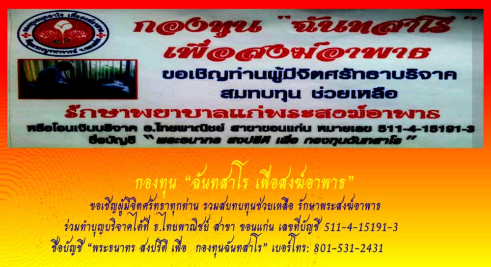 ขอเรียญเชิญพี่ๆผู้มีจิตศรัทธาทุกท่าน ร่วมสมทบทุน"กองทุน ฉันทสาโร เพื่อสงฆ์อาพาธ"