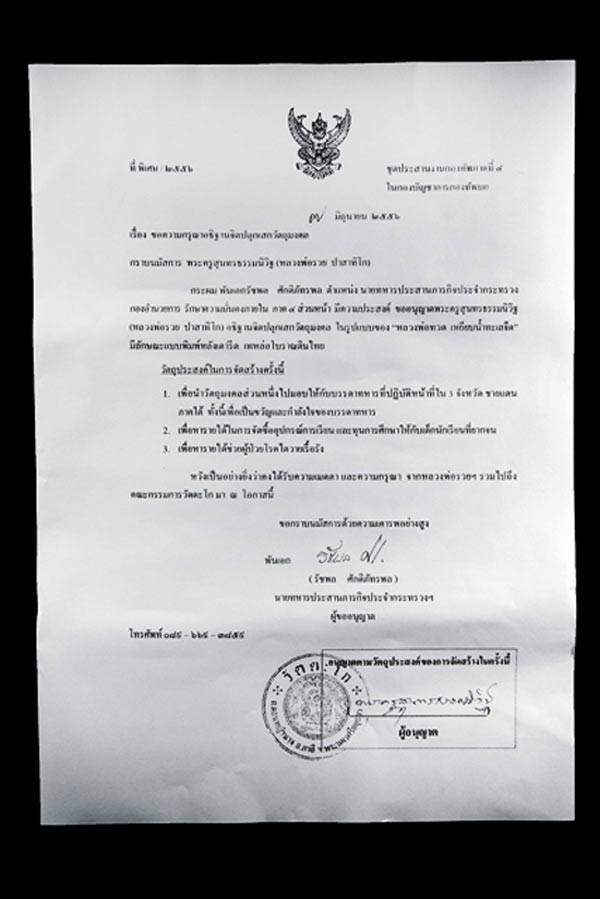 หลวงพ่อรวย และคณะกรรมการวัดตะโก ได้เมตตาเห็นชอบอนุญาติให้นายทหารประสารงาน ประจำกระทรวงกองอำนวยการรักษาความมั่นคงภายใน กองทัพภาค 4 ส่วนหน้าได้จัดสร้างวัตถุมงคล และให้หลวงพ่อรวยได้เมตตาอธิษฐานจิตปลุกเสก หลวงปู่ทวดพิมพ์เตารีดหล่อโบราณเทดินไทย