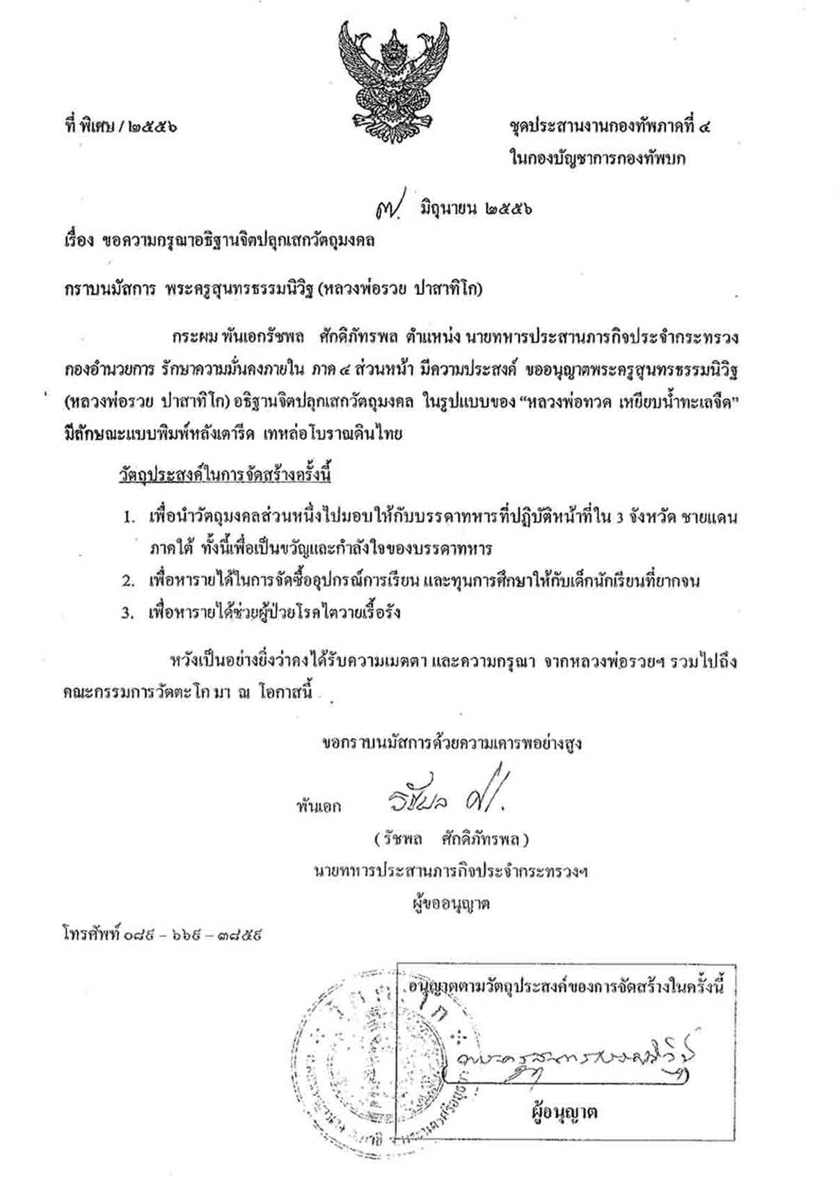 หลวงพ่อรวย และคณะกรรมการวัดตะโก ได้เมตตาเห็นชอบอนุญาติให้นายทหารประสารงาน ประจำกระทรวงกองอำนวยการรักษาความมั่นคงภายใน กองทัพภาค 4 ส่วนหน้าได้จัดสร้างวัตถุมงคล และให้หลวงพ่อรวยได้เมตตาอธิษฐานจิตปลุกเสก หลวงปู่ทวดพิมพ์เตารีดหล่อโบราณเทดินไทย
