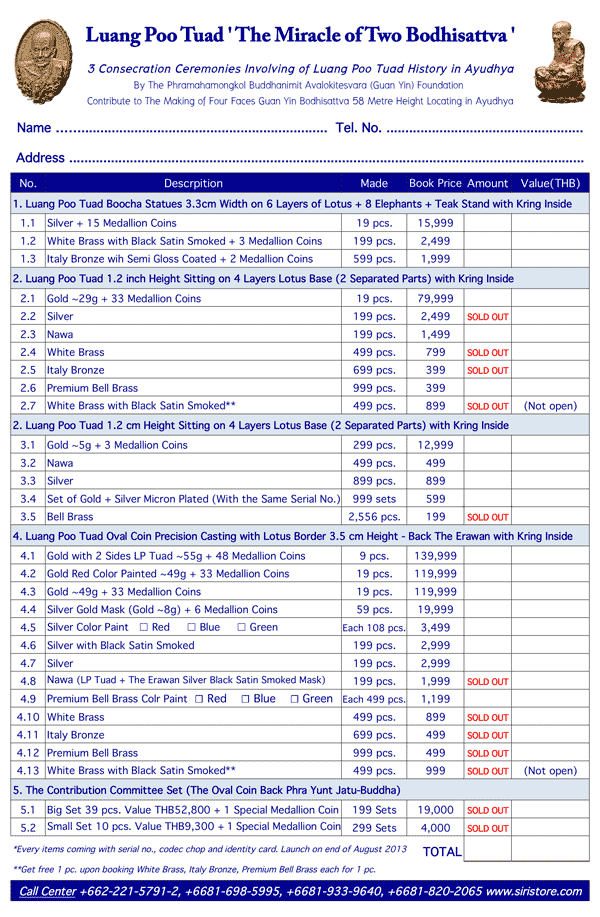 สำหรับรายการเหรียญเงินองค์ทองคำนี้จะมีองค์ลป.ทวดเท่านั้นที่เป็นเนื้อทองคำ นน.ประมาณ 8 กรัม ซึ่งเมื่อคิดเป็นราคาทองคำจะอยู่ที่ประมาณหมมื่นกว่าบาทแล้วครับ ยังไม่รวมตัวเหรียญซึ่งประกอบด้วยเนื้อเงินทั้งหมดอีก 4 ชิ้น (รวมทั้งหมดเป็นประกอบ 5 ชิ้น) และยังมีเหรียญปั๊มฉากเงาแถมให้อีก 6 องค์ มูลค่า 2,500 บาทอีกด้วย