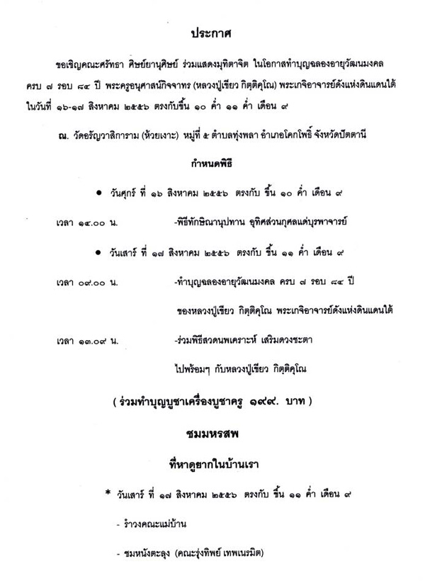 จะมีงานพิธี ร่วมแสดงมุทิตาจิต ในโอกาสทำบุญฉลองอายุวัฒนะมงคลครบ 7 รอบ 84 ปี พ่อท่านเขียววัดห้วยเงาะ