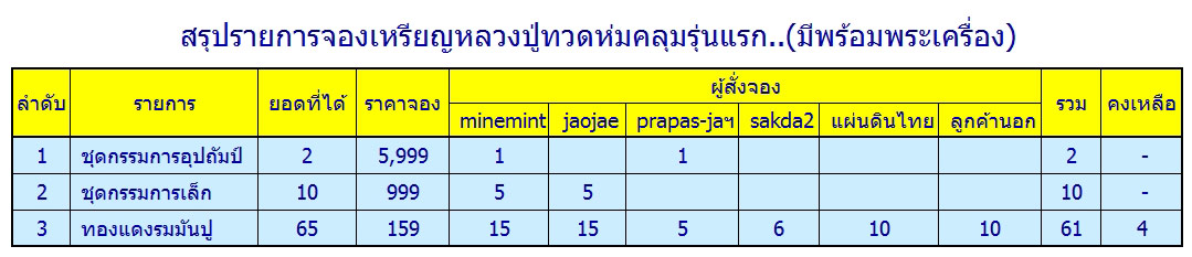 | หัวข้อกระทู้ : => สรุปผลการจอง หลวงปู่ทวด ห่มคลุมรุ่นแรก....(มีพร้อมพระเครื่อง) |