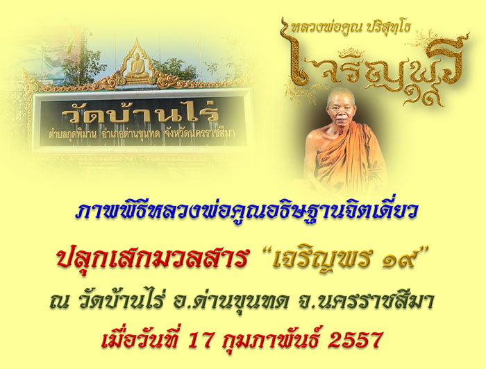 โดยวันนี้ จะเป็นภาพบรรยากาศพิธีอธิษฐานจิตเดี่ยว โดย หลวงพ่อคูณ ปริสุทฺโธ ท่านได้เมตตาปลุกเสกชนวนมวลสาร "เจริญพร ๑๙" ให้เมื่อวันที่ 17 กุมภาพันธ์ 2557 เวลาประมาณ 14.19 น. ณ วัดบ้านไร่ อ.ด่านขุนทด จ.นครราชสีมา