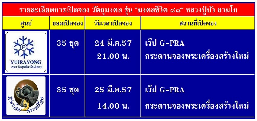 | หัวข้อกระทู้ : => แจ้งรายละเอียดการเปิดจอง วัตถุมงคลรุ่น "มงคลชีวิต ๘๘" ลป.บัว ถามโก ในเว๊ปจีพระครับ ! |