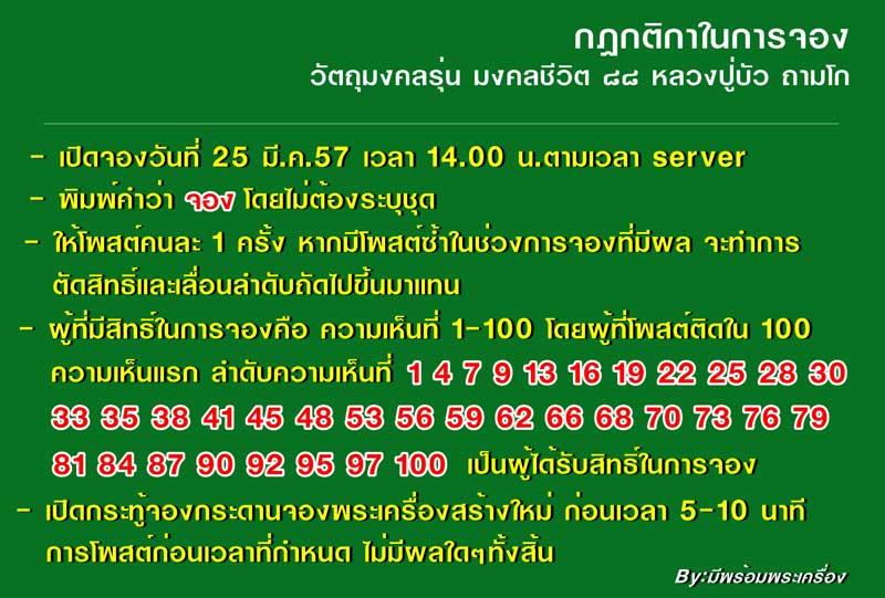 | หัวข้อกระทู้ : => "มงคลชีวิต ๘๘" หลวงปู่บัว ถามโก ก่อนเปิดจองบ่ายสองวันนี้ มาดูกฏกติกาการจองกันก่อนครั |