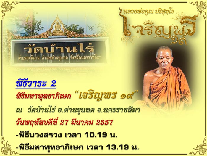 พิธีครั้งนี้จัดเป็นพิธีวาระที่ 2 ซึ่งเป็นพิธีมหาพุทธาภิเษกครั้งสำคัญ สำหรับรุ่น เจริญพร ๑๙ และหลังจากนี้ผ่านไป ก็จะเหลืออีก 1 วาระ เป็นวาระ 3 ซึ่งจะประมาณปลายเดือนเมษายน 2557 (ก่อนที่จะรับพระ)