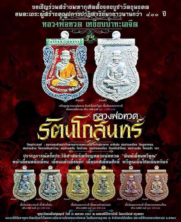 วัตถุมงคลเหรียญเสมาหน้าเลื่อน พิมพ์เลื่อนทวัคูณ (เลื่อนแล้วเลื่อนอีก) "หลวงพ่อทวด รัตนโกสินทร์" วัตถุประสงค์เพื่อสมทบทุนช่วยค่ารักษาพยาบาลพระเกจิอาจารย์อาพาท อาทิเช่น พ่อท่านคล้อย วัดภูเขาทอง,