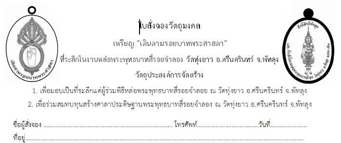 วัตถุประสงค์ : สมทบทุนสร้างศาลประดิษฐานพระพุทธบาทสี่รอยจำลอง ณ วัดทุ่งยาว จ.พัทลุง