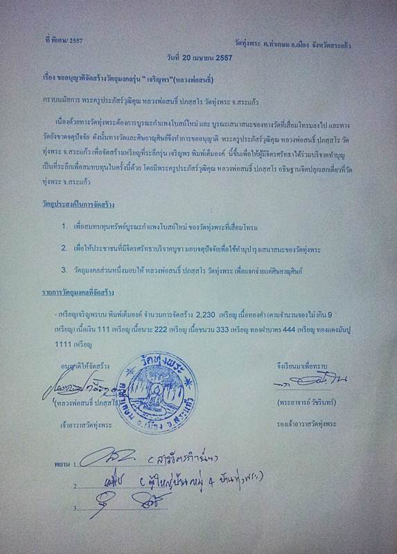 โดยจะจัดให้เปิดจอง " เหรียญเจริญพร ๘๗ " หลวงพ่อสนธิ์ ปภสฺสโร