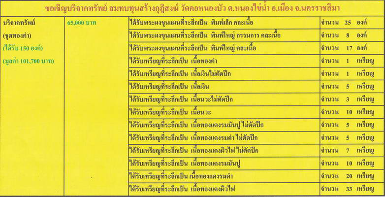 1. ทำบุญบริจาคทรัพย์ ชุดทองคำ ทีหน้ากระดานจองพระเครื่องสร้างใหม่ 10 กรกฎาคม 2557 จำนวน 9 ชุด ชุดๆละ 65,000.-บาท ได้รับเหรียญโบว์ห่วงเชื่อมเต็มองค์ จำนวน 100 เหรียญ มูลค่า 101,700.-บาท และพระผงขุนแผน เจริญพรบน จำนวน 50 องค์