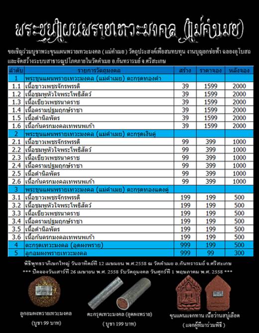 ขอเชิญร่วมบูชาพระขุนแผนพรายเทวะมงคล ( แม่คำเมย ) วัตถุประสงค์เพื่อสมทบทุน ทำบุญยกช่อฟ้า ฉลองอุโบสถและจัดสร้างระบบสาธารณูปโภคภายในวัดคำเมย อ.กันทรารมย์ จ.ศรีสะเกษ