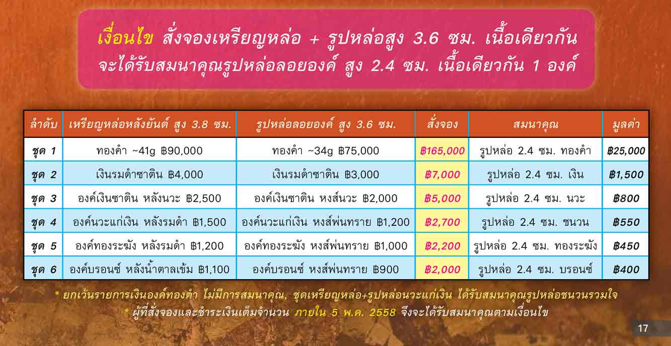 ปล. กรณีท่านใดไม่ได้จองเหรียญหล่อคู่กับรูปหล่อลอยองค์ตามเงื่อนไขด้านบน ศูนย์รับจองมีสิทธิ์ที่จะจองรายการที่ขาดไปเพื่อได้สมนาคุณแทนได้เลยนะครับ เพราะฉะนั้นแล้วถ้าท่านไม่อยากเสียสิทธิ์อันคุ้มค่านี้ก็เลือกจองเป็นชุดก็จะ "ไม่เสียสิทธิ์" เปล่าๆ นะครับ |