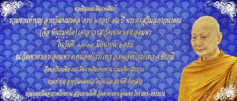 ***ผู้ร่วมในงานอายุวัฒนะมงคล 72 ปี ครบ 6 รอบ หลวงปู่จื่อ พันธมุตโต 13-14 มิถุนายน 2558 รับแจกพระผงพุทธคุณ 6 รอบ จำนวน 62,929 องค์และเหรียญครบ 6 รอบพิม์ครึ่งองค์ 2,500เหรียญ เต็มองค์ 2,500 เหรียญได้ฟรีในงาน หรือสอบถามร่วมบุญจองโรงทานได้โดยตรงที่วัดเขาตาเงาะอุดมพร โทร 093-3933131(พระอาจารย์ครูบาแมว)