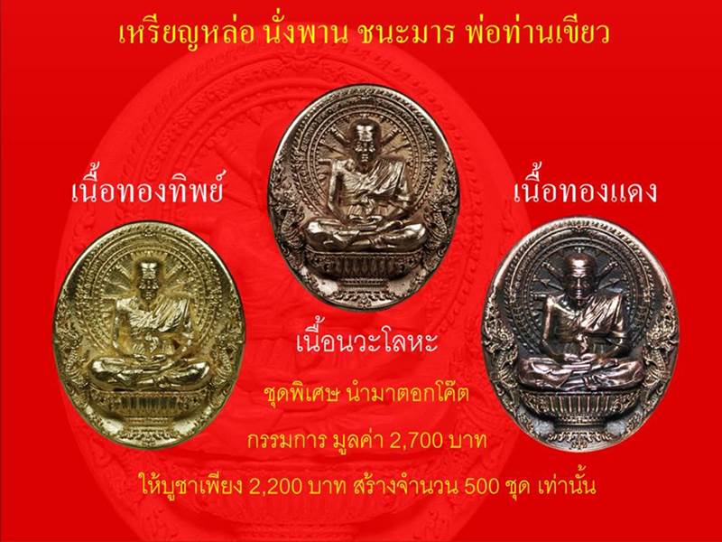 คืนนี้ให้ดูชุดพิเศษ สร้างเพียง 500 ชุด โดยนำเหรียญหล่อเนื้อนวะโลหะที่สร้างจำนวน 500 องค์ นำมาจัดชุดพิเศษ รวมกับ เหรียญหล่อเนื้อทองทิพย์ และเนื้อทองแดง สามองค์ ในมูลค่า 2700 บาท ให้บูชา เพียง 2200 บาท โดยเหรียญหล่อนวะโลหะ ไม่มีให้จองกันนะครับ ส่วนเนื้อทองแดง และเนื้อทองทิพย์ จะเหลือแค่ อย่างละ 500 เหรียญเท่านั้น |
