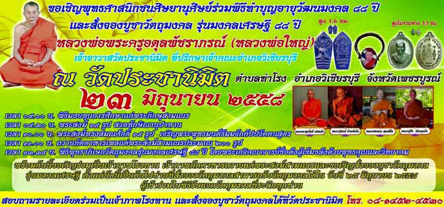 พิธีปลุกเสก วัตถุมงคล รุ่น มงคลเศรษฐี 88 (หลวงพ่อใหญ่) วัดประชานิมิตร เมื่อวันที่ 23 มิถุนายน 58 ที่ผ่านมา..