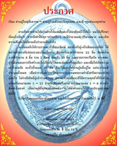 รุ่นครบ ๖ รอบ อายุวัฒนะมงคล ๗๒ ปี หลวงปู่จื่อ พันธมุตโต วัดเขาตาเงาะอุดมพร ด้วยคณะผู้รับผิดชอบในการจัดสร้างได้ปรึกษาและลงมติกันแล้วว่า