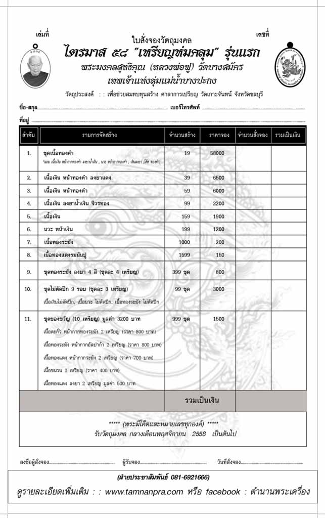เพื่อสมทบทุนสร้างศาลาการเปรียญวัดเกาะจันทน์ อ.เกาะจันทร์ จ.ชลบุรี โดยหลวงพ่อฟู