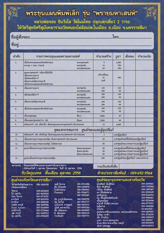 วาระที่ 2 ปลุกเสก พระผงขุนแผนพรายมหาเสน่ห์ พิมพ์เล็ก ในวันที่ 2 พฤศจิกายน 2558 เวลา 16.09 น. ให้กับวัดวิสุทธิศรีสุมังคลาราม(วัดหนองไผ่ล้อม) ต.ในเมือง อ.เมือง จ.นครราชสีมา