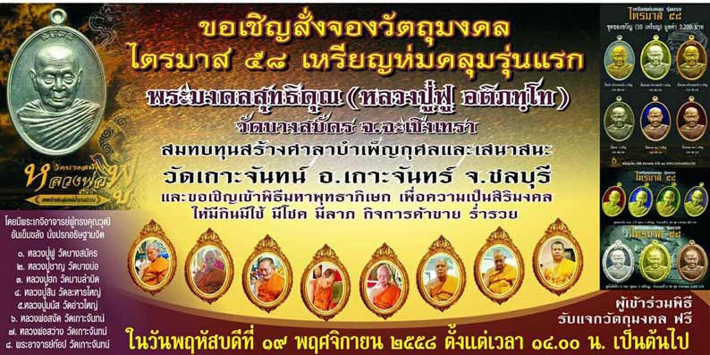 วัตถุประสงค์ : เพื่อสมทบทุนสร้างศาลาการเปรียญวัดเกาะจันทน์ อ.เกาะจันทร์ จ.ชลบุรี |