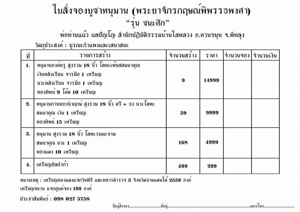 รายชื่อศูนย์จองหนุมาน "พระยาจักรกฤษณ์พิพรรธพงศา" รุ่น ชนะศึก