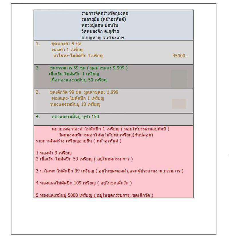 รายการจัดสร้าง รายชื่อศูนย์จอง เหรียญอายุยืน ( หน้าอรหันต์ ) หลวงปู่แสน ปสนฺโน ๑๐๙ ปี