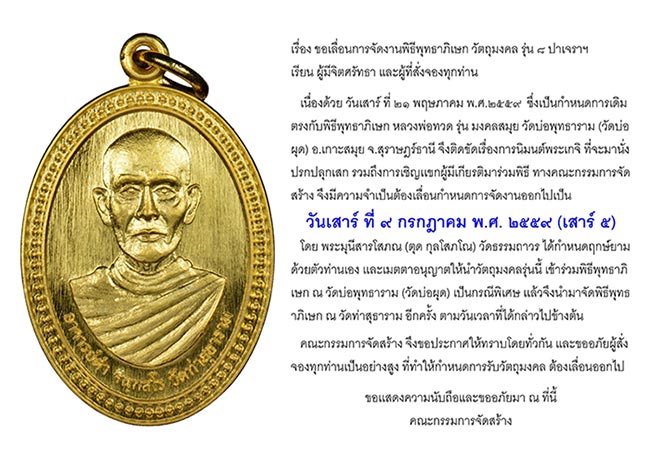 เนื่องด้วยทางคณะกรรมการ และแขกผู้เกียรติ บางท่านได้ติดภารกิจ ต้องเดินทางไปร่วมพิธีพุทธาภิเษก หลวงพ่อทวด รุ่น มงคลสมุย ณ. วัดบ่อพุทธาราม(วัดบ่อผุด)อ.เกาะสมุย จ.สุราษฏร์ธานี ในวันเสาร์ที่ 21 พฤษภาคม 2559 (เป็นกรณีพิเศษ)