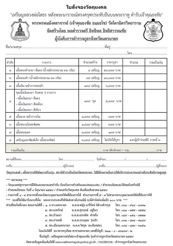 วัตถุประสงค์ : เพื่อหารายได้พัฒนาปรับปรุง สถานีตำรวจในจังหวัดนครนายก ให้มีศักยภาพในการให้บริการประชาชนอย่างมีประสิทธิภาพสูงสุด