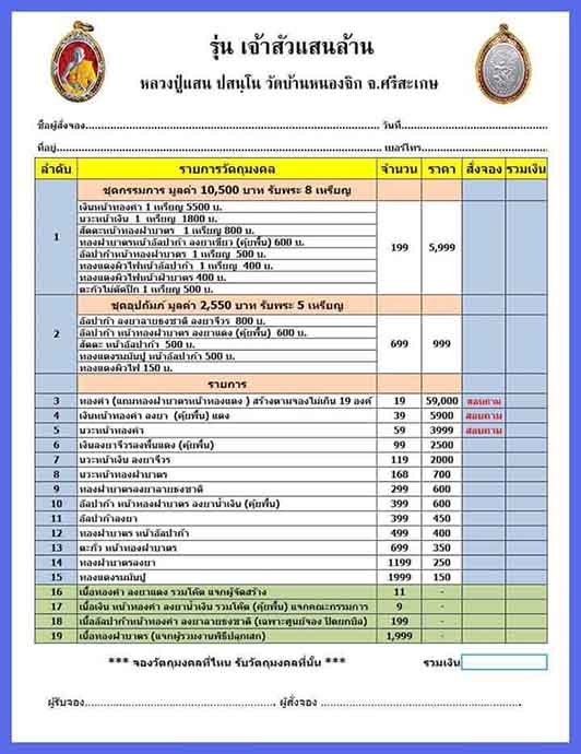 เหรียญเจ้าสัวแสนล้าน อีกหนึ่งงานบุญที่ทำด้วยหัวใจ โดยทีมงานพุทธคุณ ขออนุญาตจัดสร้างอย่างถูกต้อง วัตถุประสงค์ในการจัดสร้างชัดเจน โปร่งใส รูปแบบเหรียญสวยงาม นามเป็นมงคล ครบถ้วนทั้งด้านพุทธคุณ และพุทธศิลป์ แต่ด้วยจำนวนการสร้างน้อยทำให้ไม่เพียงพอต่อความต้องการของศิษยานุศิษย์จำนวนมาก