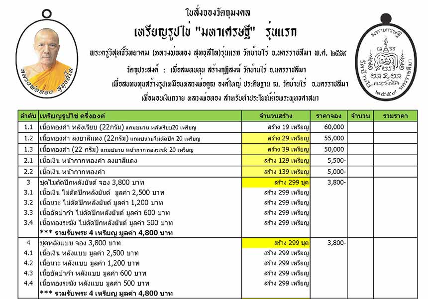 รายการจำนวนจัดสร้างปรับเปลี่ยนใหม รุ่น มหาเศรษฐี พระครูวิสุทธิ์วิทยาคม (หลวงพ่อทอง สุทธฺสีโล)