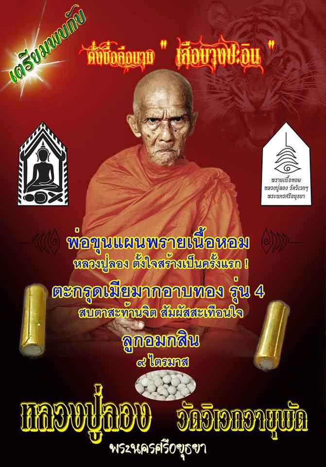 ขณะนี้อยู่ในช่วงการเปิดจอง ระหว่าง 1 สิงหา 1 กันยา 2559 ปลุกเสกรับพระไม่เกิน 30 กันยา 255 สั่งจองได้ที่ วัดวิเวกวายุพัด หลวงพี่โต้ง และ เพสนี้ หรือที่ ชมรมเฟสบุค เสือบางปะอิน หลวงปู่ลอง วัดวิเวกวายุพัด หรือ ตามศูนย์พระเครื่อง |