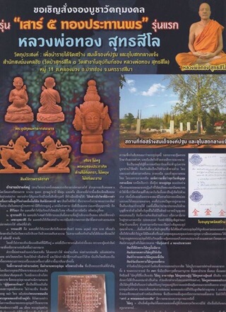 ไม่ขอให้ท่านจองเยอะๆแต่อยากให้ท่านได้จองร่วมบุญคนละน้อย กับเสาร์ ๕ ทองประทานพร มาร่วมบุญด้วยการจองบูชาเพื่อนำรายได้มาจัดสร้างสมเด็จองค์ปฐม ซึ่งจะเป็นทั้งโบสถ์กลางแจ้ง ส่วนลานตรงหน้าจะเป็นที่ปฏิบัติธรรม ฐานพระด้านล่างจะเป็นกุฏิสงฆ์ ทำอย่างเดียวแต่ได้ครบทั้ง ๔ อย่าง และรายได้ส่วนหนึ่งจะนำถวายหลวงพ่อ มฝลูกศิษย์หลวงพ่อจึงไม่ควรพลาดกับงานบุญดีๆครั้งนี้ทุกอย่างวัดจัดสร้างเอง ไม่มีนายทุน เพื่อวัดจะได้เจริญ มาช่วยกันนะผู้ใจบุญทุกๆท่าน( หล่อตัวอย่าง ยังต้องแก้ไขให้สวยคมชัดอีกอยู่ ที่ลงนี้เป็นแค่ตัวอย่างเท่านั้น) |