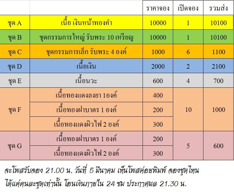 โดยในวันที่ 5 มีนาคม เวลา 21.00 น. ในราคาวัดบวกค่าจัดส่ง ที่กลุ่ม ชมรมพระเครื่อง หลวงพ่อใย วัดปากป่า อ.บ้านค่าย จ.ระยอง ทางเฟซบุ้ค ชมรมพระเครื่อง หลวงพ่อใย วัดปากป่า อ.บ้านค่าย จ.ระยอง https://www.facebook.com/groups/Luangporyai โดยจะมีกรทูใหม่ขึ้นมาแล้ะทำการโพสจองชุดที่ต้องการ 1 ท่านต่อ 1 ชุดเท่านั้น