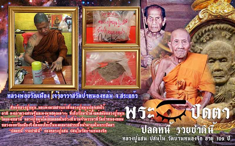 -ผงมวลสารเก่าหลวงปู่หมุน จากพระอาจารย์ขวัญเมือง เจ้าอาวาสวัดป่าหนองหล่ม ได้มอบให้ไว้นำไปเป็นมวลสารเพื่ออุดในองค์พระปิดตา ปลดหนี้ รวยชาตินี้ หลวงปู่แสน วัดบ้านหนองจิก