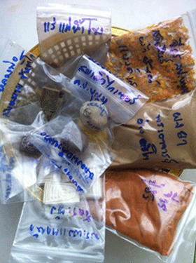 6.ผงดอกไม้ ธูปเทียน ขันครู 7.ผงธูปในโบสถ์ 8.ดินจอมปลวก 9.ผงกระเบื้องหลังคาโบสถ์เก่า 10.ผงดักแด่หิน