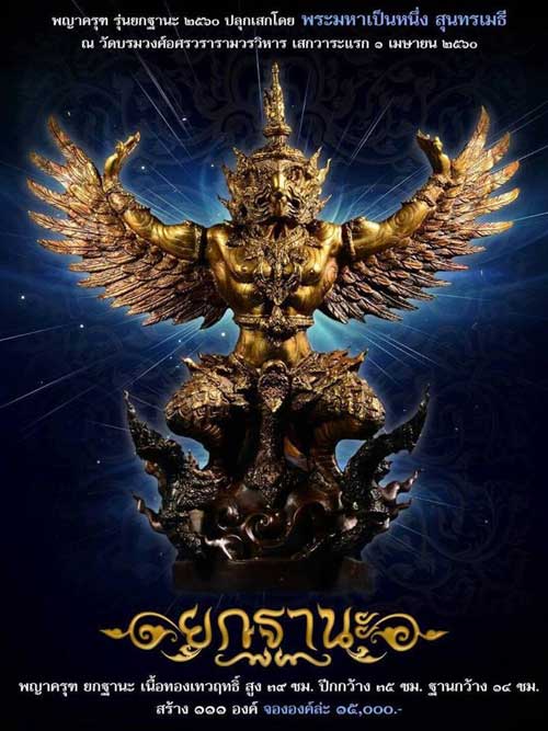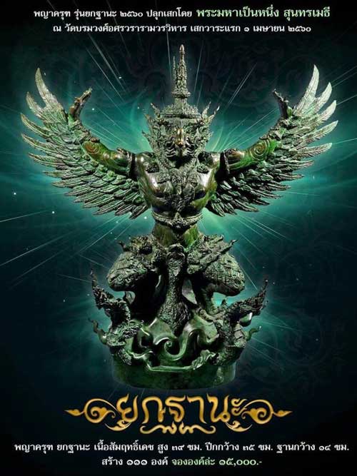 1.พญาครุฑ ยกฐานะ เนื้้อสัมฤธิ์เดช สูง ๓๙ ซม. ปีกกว้าง ๓๕ ซ.ม ฐานกว้าง ๑๔ ซ.ม สร้าง ๑๑๑ องค์ จององค์ละ ๑๕,๐๐๐ -