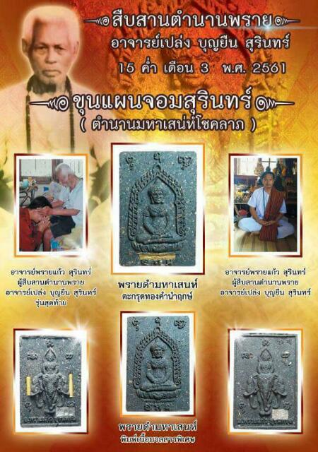 ตำนานขุนแผนจอมสุรินทร์ ของอาจารย์เปล่งบุญยืน ที่มีประสบการณ์ด้านเมตตาค้าขายมหาอำนาจเจริญรุ่งเรืองและมีราคาแพงมาก และเล่นหายากมากขึ้น จึงเป็นเหตุให้เกิด ตำนานพระขุนแผน จอมสุรินทร์ รุ่นประวัติศาตร์นี้ขึ่นมาถึอเป็นรุ่น๒ สร้าง โดยศิษย์ผู้ใกล้ชิด ได้ครอบครูโดยตรงจากท่านอาจารย์เปล่ง ปุญยืน อาจารย์พรายแก้ว สุรินทร์ ซึ่งได้รวบรวมมวลสารของท่านอาจารย์เปลล่งทุกรุ่นน้ำมันพรายแม่น้ำฝนอันโด่วดังผงพรายต่างๆตามตำราที่ได้ศึกษาได้ฤกษ์ดีขึ่น1515ค่ำ เดือน3 พศ 2561 จันทรยุปราคาเป็นวันที่แรงมากๆการสร้างเครื่อวรางของขลังและพรายขุนแผนจอมสุรินทร์จึงได้กำเหนิดขึ้นด้วยมวลสารที่แรงฤกษ์ดีคนสร้างเป็นศิษย์โดยตรงครอบครู และยังมีเกจิที่เก่งๆร่วมเสกหลายท่านในสายพรายเนื้อผงพรายว่านดอกทองนำฤกษ์ลองพิมพ์สร้าง21 องค์
