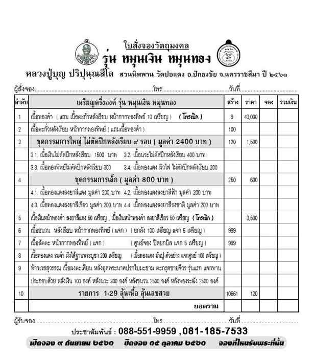 รายชื่อศูนย์จอง หลวงปู่บุญ รุ่นหมุนเงินหมุนทอง