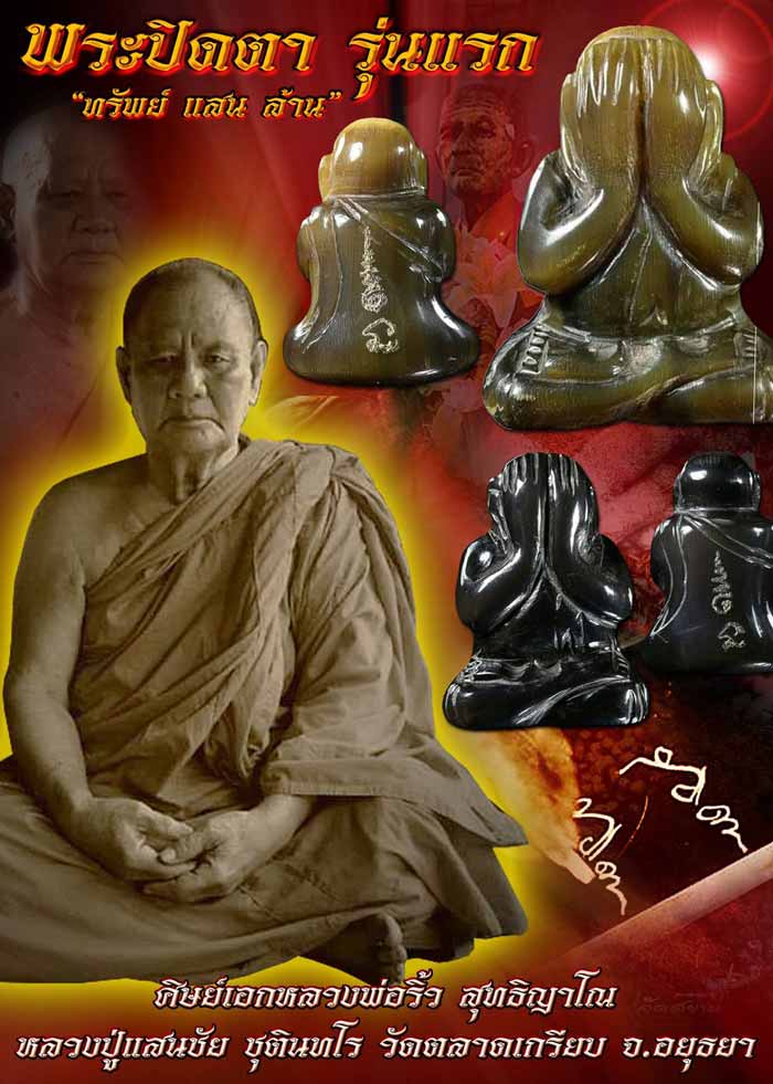 พระปิดตาทรัพย์แสนล้านรุ่นแรก สร้างจากเขาควายแกะที่มีคุณในตัวดีอยู่แล้ว พุทธคุณเด่นด้านเมตตามหานิยม อีกทั้งยังอุดด้วยมวลสารหลายอย่าง เช่น ผงพระสมเด็จหลวงพ่อริ้วพระอาจารย์ของหลวงปู่แสนชัย ผงธูปจาก อนุสรณ์หลวงพ่อริ้ว ผงพุทธคุณ 108 เกศา จีวร หลวงปู่แสนชัย ดอกรัก ดอกดาวเรือง ด้านหลังพระปิดตาทรัพย์แสนล้านรุ่นนี้ยังกำกับด้วย "ยันต์นะ ซึ่งเป็นยันต์ตัวเดียวที่มีพุทธคุณดีทุกด้าน หรือมีพุทธคุณครอบจักรวาล" ที่สำคัญอักขระตัว "นะ" ถือเป็นยันต์ครูด้วย จากนั้นได้ฤกษ์ ตามโบราณ สำเภาพ่อค้า ก็ลงคาถาอาคมกำกับเพื่อให้พระปิดตา ทรัพย์แสนล้าน มีพุทธานุภาพสูงยิ่งขึ้น จะได้มีคุณแก่ผู้ที่นำไปใช้ ให้ทำมาค้าขายดี ร่ำรวย มีเสน่ห์ เมตตามหานิยม |