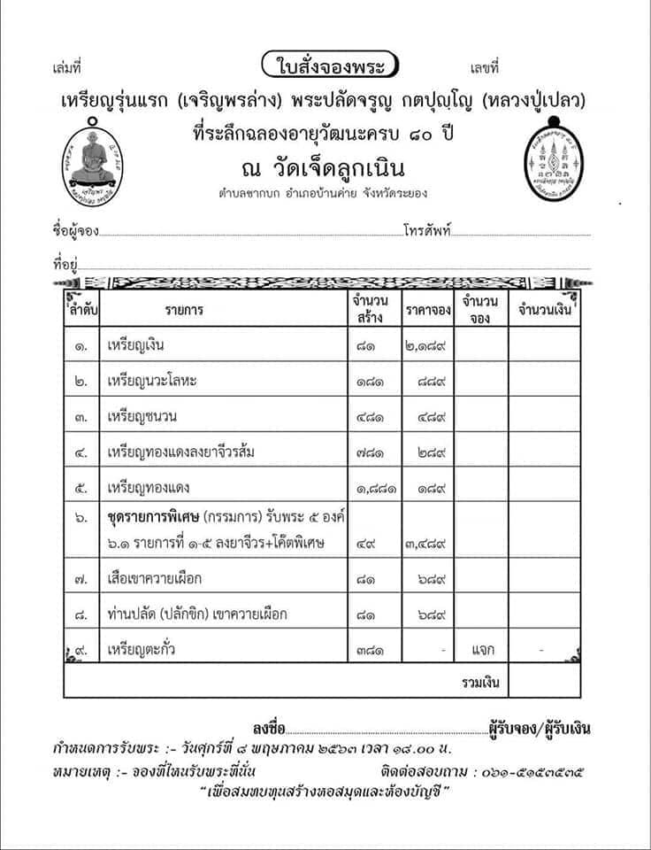 วัตถุมงคลรุ่นนี้ จะประกอบพิธีพุทธาภิเษก วันที่ 8 พ.ค.2563 ที่จะถึงนี้ ที่อุโบสถวัดเจ็ดลุกเนิน จ.ระยอง มีพระเกจิชื่อดัง 12 รูปนั่งปรกอธิษฐานจิตปลุกเสก