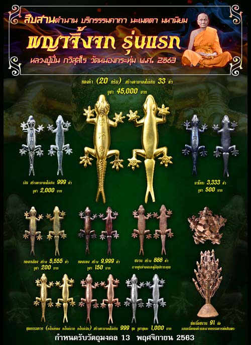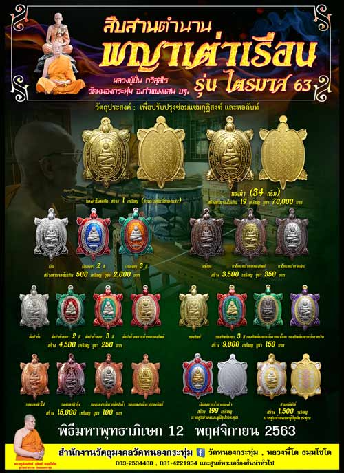 ขอเชิญร่วมพิธีมหาพุทธาภิเษก วัตถุมงคลไตรมาส๖๓ หลวงปู่ปั่น วัดหนองกระทุ่ม อ.กำแพงแสน จ.นครปฐม พญาเต่าเรือน รุ่นไตรมาส๖๓ และพญาจิ้งจกรุ่นแรก หลวงปู่ปั่นท่านเสกไตรมาส ๓ เดือนทุกวันตลอดช่วงเข้าพรรษา และได้ทำพิธีมหาพุทธาพิเษกใหญ่ที่อุโบสถวัดหนองกระทุ่มที่บูรณะใหม่พร้อมทั้งงานยกช่อฟ้าโบสถ์ในวันดียวกันซึ่งจัดขึ้น วันที่ ๑๒ พฤศจิกายน ๒๕๖๓ ในงานมีเหรียญแจกทานสำหรับผู้มาร่วมพิธีหลังจากเสร็จงานแล้วสามารถบูชาวัตถุมงคลได้ทันที่ครับ |