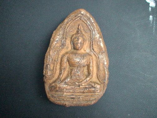 พุทธลักษณะ เป็นพระปางมารวิชัย สถิตอยู่บนพื้นฐานรูปกมลรี ส่วนกว้างทั้งหมดของพื้นฐานประมาณ 3.5 เซนติเมตร ส่วนสูงวัดได้ประมาณ 5.3 เซนติเมตร ฐานขององค์พระปรากฎเป็นเส้นนูนออกมาขนานกัน 2 เส้น ด้านหลังพื้นฐานโค้งนูน