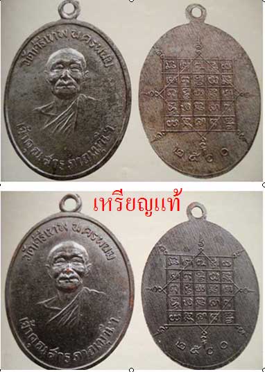 ภาพเปรียบเทียบเหรียญแท้ - เก้ ขอให้สังเกตุเส้นสายตัวหนังสือเหรียญแท้จะคมชัด ปลายสระเอ คำว่าเทพจะมีเส้นเกินขึ้นไป ส่วนด้านหลังเหรียญแท้จะมีส่วนเนื้อเกินตรงขอบเหรียญด้านล่าง ส่วนนี้เป็นเพราะบล็อคตัวตัดจะกว้างกว่าเส้นขอบเหรียญส่วนนี้จะเป็นเอกลักษณ์ของเหรียญ ถ้าไม่มีน่าจะเป็นเหรียญเก้ แต่ทั้งนี้ทั้งนั้นก็ให้พิจาราณาดีๆแล้วกัน |