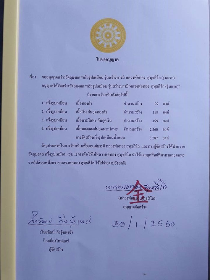 ผู้สร้าง คุณไชย์วัฒน์ กิ่งรุ้งเพชร์ ได้ถวายเงินสดเลยเมื่อ 9 กรกฏาคม 2560 ให้หลวงพ่อทอง ไว้ใช้จ่ายตามศัธยาศัย 100,000 บาท(หนึ่งแสนบาทถ้วน) ตามที่บอกหลวงพ่อไว้เลยครับ และผู้สร้างได้ถวายอีก 105,000 บาท(หนึ่งแสนห้าพันบาทถ้วน) ในงานกฐินวัดบ้านไร่ เพื่อสบทบทุนสร้างกุฏิสงฆ์วัดบ้านไร่ เมื่อ 1 พฤจิกายน 2560 ถวายในนาม หลวงพ่อทอง สุทฺธสีโล