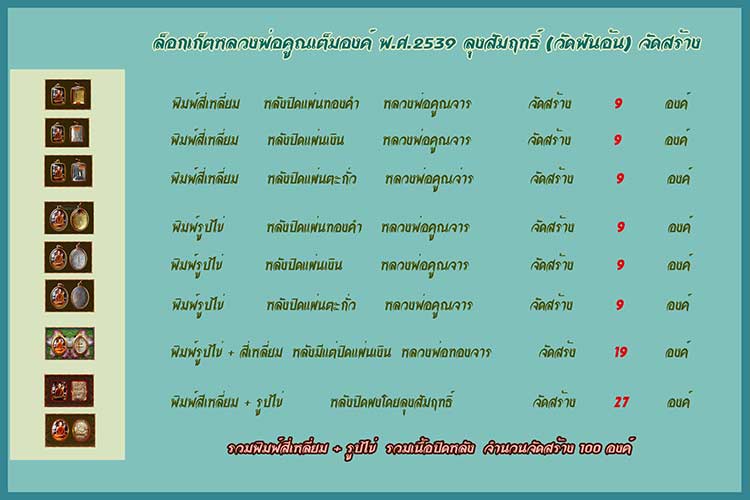 สุดยอดล็อกเก็ตเต็มองค์หลวงพ่อคูณลงจาร ปี ๒๕๓๙ ลุงสัมฤทธิ์(สร้างพระผงวัดพันอ้น)จัดสร้างให้ หลวงพ่อคูณจารครับ.........เริ่มต้นที่สั่งล็อกเก็ตจากโรงงานพิมพ์สี่เหลี่ยม+รูปไข่ทำมา ๑๐๐ องค์.....๑.พิมพ์สี่เหลี่ยมหลังปิดแผ่นทองคำ+เงิน+ตะกั่วอย่างละ ๙ องค์ รวม ๒๗ องค์.......๒.พิมพ์รูปไข่หลังปิดแผ่นทองคำ+เงิน+ตะกั่ว อย่างละ ๙ องค์ รวม ๒๗ องค์....พิมพ์สี่เหลี่ยม๒๗องค์+พิม์รูปไข่๒๗องค์ รวมเป็น ๕๔ องค์ หลวงพ่อคูณจารให้ครบทั้ง ๕๔องค์ เป็นสโลแกนของรุ่นนี้ "จารไปบ่นไป" (หลวงพ่อคูณบ่นเพราะเมตตาที่ลุงสัมฤทธิ์เป็นลูกศิษย์รุ่นยุคแรกสมัยยังหนุ่มๆอยู่ ขณะจารเวลานั้นประชาชนจำนวนมากมารอกราบลพ.คูณที่หน้าห้อง ลพ.คูณจารไปเรื่อยๆก็ถามว่าหมดยังๆ)...ที่เหลือสี่เหลี่ยม+รูปไข่ ๑๙ องค์ปิดแต่แผ่นเงินที่เหลือ ให้พระอาจารย์ทองจารต่อ(ศิษย์เอก ลพ.คูณ) เดี๋ยวต้องถามลุงสัมฤทธิ์ว่าพระอาจารย์ทองจารไปบ่นไปหรือปล่าวว่าทำไม่จารน้อยจัง...๕๕๕....๕... อีก ๒๗ องค์ ลุงสัมฤทธิ์นำไปปิดผงต่อ(ผงสูตรเดียวกับพระผงวัดพันอ้นยุกแรกปี ๒๒-๒๓) รวมแล้วครบ ๑๐๐ องค์.....เพื่อนสมาชิกเข้ามาอ่านประวัติไล่ลำดับการจัดสร้างให้ดี เวลาไปพบเจอที่ไหนจะได้มั่นใจและไม่พลาดในการเช่าเก็บบูชาครับ....... |