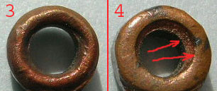- ด้านหน้าให้ดูที่ห่วงครับ ภาพที่ 1-3 เป็นห่วงของเหรียญแท้ ส่วนภาพที่ 4 เป็นเหรียญเก๊ จะสังเกตุเห็นความแตกต่างตามที่ลูกศรชี้ครับ ของแท้จะมีเนื้อเกินอยู 3 ริ้ว ริ้วที่ 3 จะจางๆกว่าริ้วที่ 1 และ 2 ส่วของเก๊ไม่มีครับ